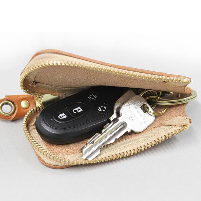ゆとりを持ってスマートキーが入る大きめサイズのL字ファスナーのキーケース。キーホルダーには5つのフックがあります。内側にはカードや切符を収納できるポケットも装備されていて、コインケースやカードケース兼キーケースという使い方もできるようになっています。